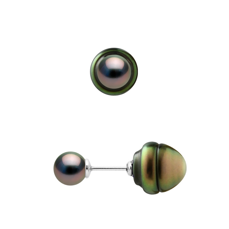 Boucles d'Oreilles RECTO VERSO - Véritables Perles de Culture de TAHITI Ronde 7-8 mm et Cerclée 11-12 mm - Système SECURITE - Argent 925 Millièmes Rhodié- Livrées avec Certificat d'Authenticité et de Garantie Internationale - Fabriqué en FRANCE