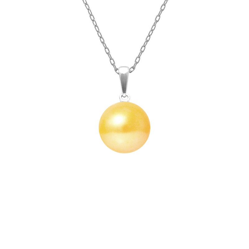 Collier Véritable Perle de Culture d'Eau Douce TRAVERSANTE Ronde 10-11 mm - COLORI JAUNE DORE - Maille Serpentine + Manchons Argent Rhodié 925 Millièmes / Longueur 42 cm - Livré avec Certificat d'Authenticité et de Garantie Internationale -