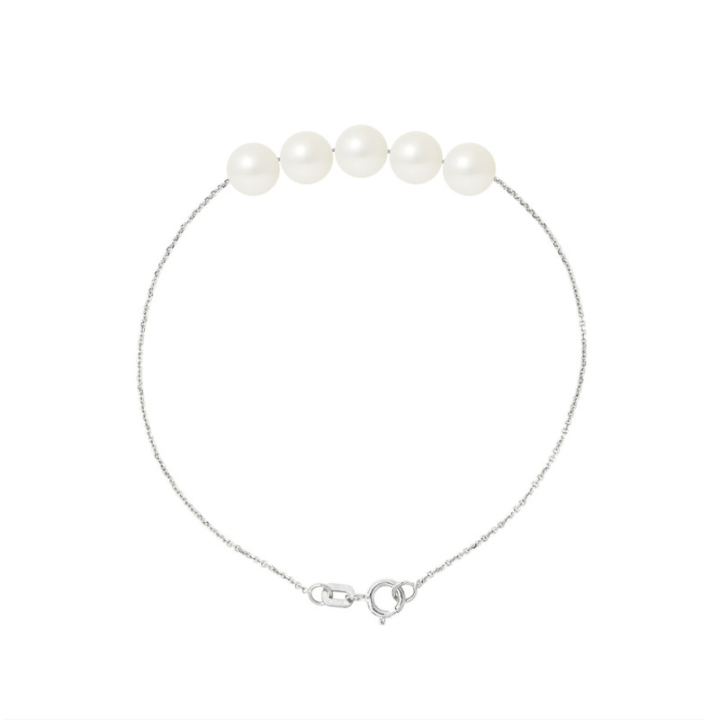 Bracelet Barette - 5 Véritables Perles de Culture d'Eau Douce Rondes 6-7 mm - COLORI BLANC NATUREL - Chaine Forçat Or Blanc - Longueur 18 cm - Livré avec Certificat d'Authenticité et de Garantie internationale