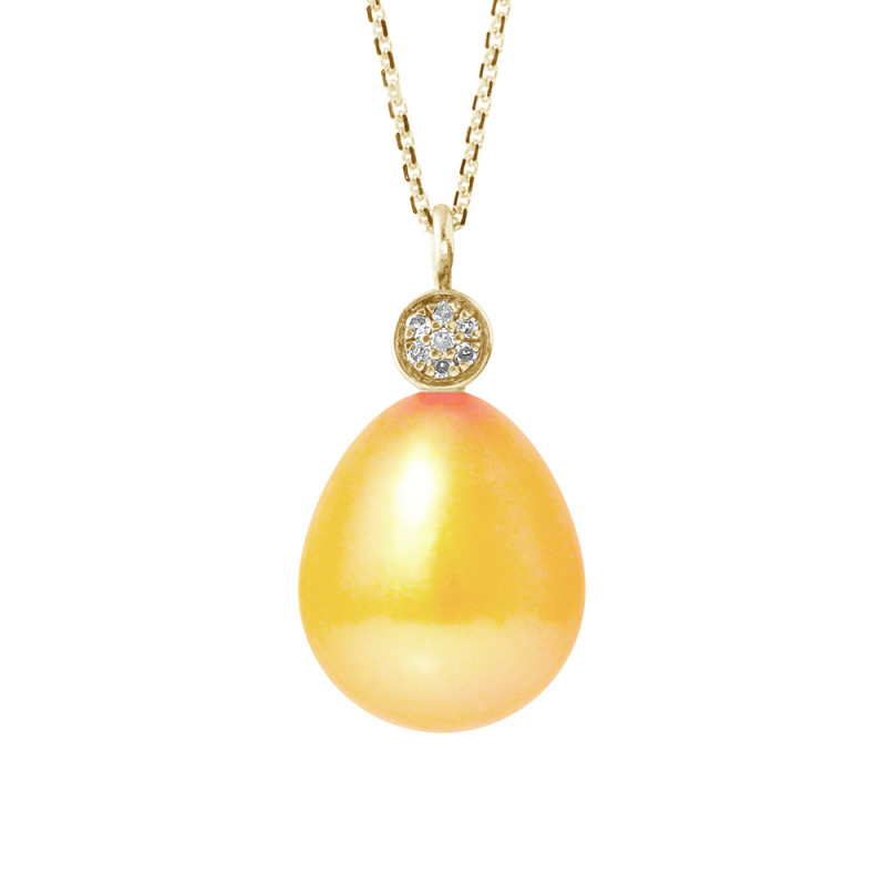 Collier PRESTIGE Or Jaune & Diamant 0.02 Cts (3 x 0,0075 Cts) - Véritable Perle de Culture d'Eau Douce Poire 10-11 mm - COLORI Jaune DORE - Maille "Forçat" / Longueur 42 cm - Livré avec Certificat d'Authenticité et de Garantie internationale -