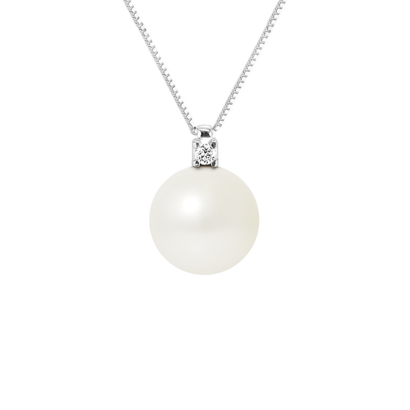 Collier PRESTIGE Or Blanc & Diamant 0.02 Cts - Véritable Perle de Culture d'Eau Douce Ronde 10-11 mm - COLORI BLANC NATUREL - Maille "Vénitienne" / Longueur 42 cm - Livré avec Certificat d'Authenticité et de Garantie internationale -