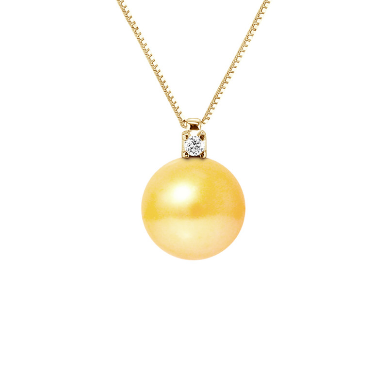 Collier PRESTIGE Or Blanc & Diamant 0.02 Cts - Véritable Perle de Culture d'Eau Douce Ronde 10-11 mm - COLORI JAUNE DORE - Maille "Vénitienne" / Longueur 42 cm - Livré avec Certificat d'Authenticité et de Garantie internationale -