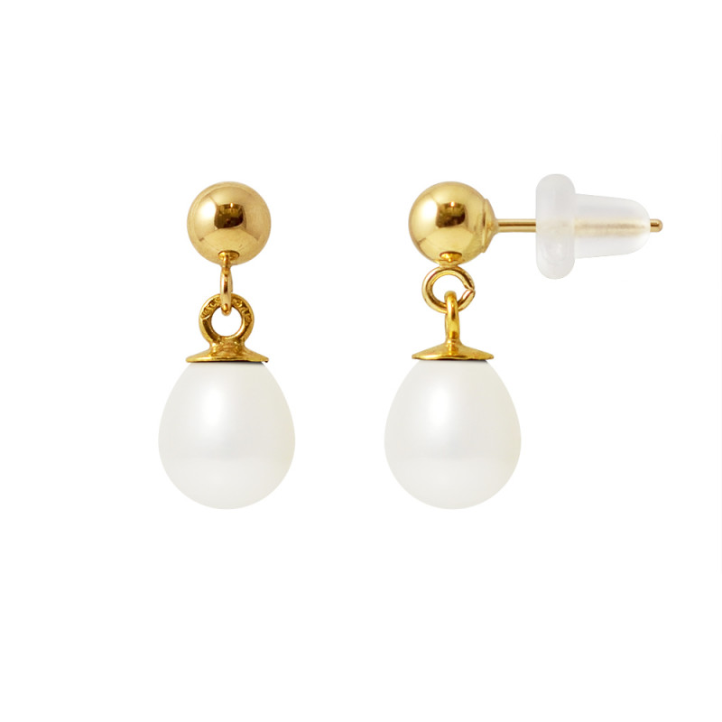 Boucles d'Oreilles Or Jaune & Véritables Perles de Culture d'Eau Douce 6-7 mm - COLORI BLANC NATUREL - Système Boules / Poussettes Silicone - Livrées avec Certificat d'Authenticité et de Garantie internationale -