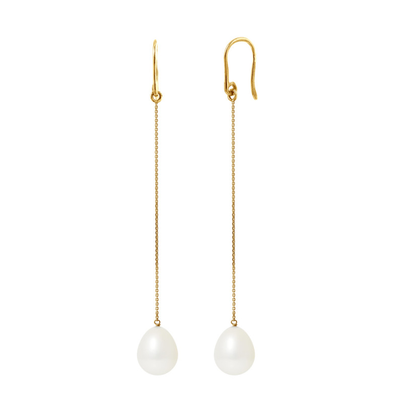 Boucles d'Oreilles Pendantes- Or Jaune - Véritables Perles de Culture d'Eau Douce Poires 8-9 mm - COLORI BLANC NATUREL - Système Crochet - Chaine Forçat Longueur 5 cm - Or Jaune 375 Millièmes - Livrées avec Certificat d'Authenticité et de Garantie Internationale