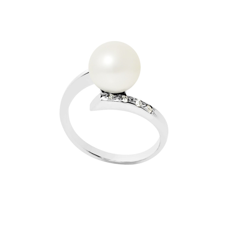 Bague Joaillerie Diamants 0,04 Cts (4 x 0,01 cts) - Véritable Perle de Culture d'Eau Douce Ronde 8-9 mm - COLORI BLANC NATUREL - DISPONIBLE TAILLE PAIRES du 48 au 62 - Livrée avec Certificat d'Authenticité et de Garantie Internationale -