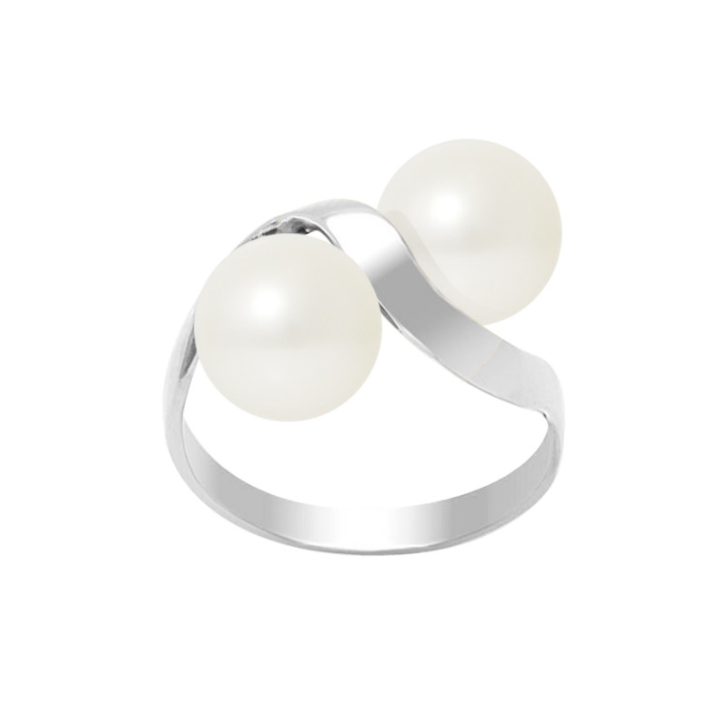 Bague Toi & Moi - Or blanc - 2 Véritables Perles de Culture d'Eau Douce RONDES 7-8 mm - COLORI BLANC NATUREL - DISPONIBLE TAILLE PAIRES du 48 au 62 - Livrée avec Certificat d'Authenticité et de Garantie internationale - MANUFACTUREE DANS NOS ATELIERS Français