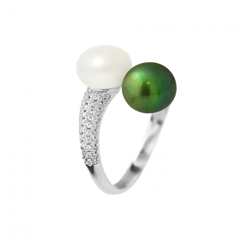 Bague Jonc Pavage Oxydes - Véritable Perle de Culture d'Eau Douce Ronde 7-8 mm - COLORI BLANC NATUREL + VERT MALCHITE - Argent 925 Millièmes Rhodié - Bague ajustable de la taille 48 à la taille 62 - Livré avec Certificat d'Authenticité et de Garantie internationale -