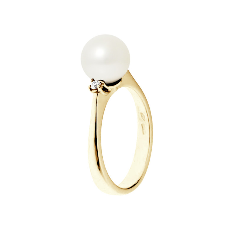Bague Joaillerie Diamants 0,06 Cts (3 x 0,03 cts) - Or jaune - Véritable Perle de Culture d'Eau Douce Ronde 8-9 mm - COLORI BLANC NATUREL - DISPONIBLE TAILLE PAIRES du 48 au 62 - Livrée avec Certificat d'Authenticité et de Garantie Internationale -