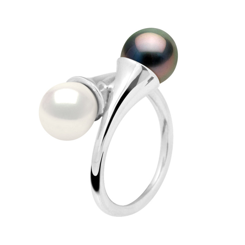 Bague Opad - Or Blanc - 2 Véritables Perles de Culture Rondes 8-9 mm - EAU DOUCE COLORI BLANC NATUREL + TAHITI - DISPONIBLE TAILLE PAIRES du 48 au 62 - Livrée avec Certificat d'Authenticité et de Garantie Internationale